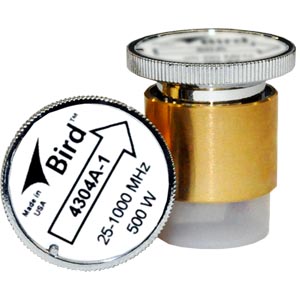 The Bird 4304A Wattmeter is an in-line sensor that measures RF power and load match in 50 Ohm coaxial transmission lines. It can be used with CW, AM, FM, and analog TV, but not pulse modulation. It is supplied with a special broadband element with a frequency range of 25 to 1000 MHz. It can measure up to 500 W, depending on the frequency, and has a maximum VSWR of 1.07 with the standard “N” connectors. A range switch allows the full scale power to be reduced for greater accuracy.